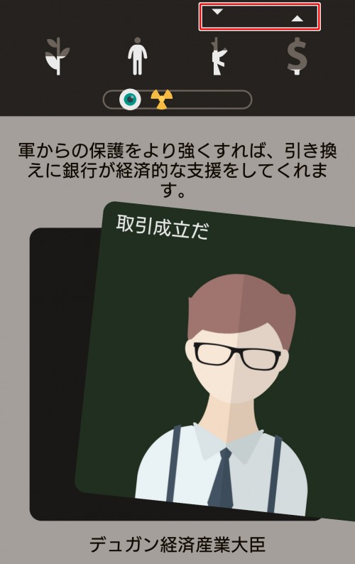 「君の役目は、まだ放射能や生物兵器の影響を受けていない、生き残った数少ない国の一つを導くことだ。4つの力のバランスをとってみろ。もしかしたら生き残れるかもしれないからな。」