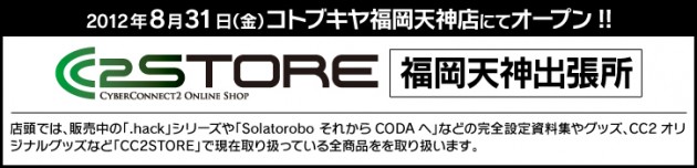 「CC2STORE」はサイバーコネクトツーが運営するオンラインストアで、「.hack」シリーズの完全設定資料集や関連グッズ、また、「Solatorobo それからCODAへ」の完全設定資料集や関連グッズ、その他CC2STOREオリジナル商品を販売しております。