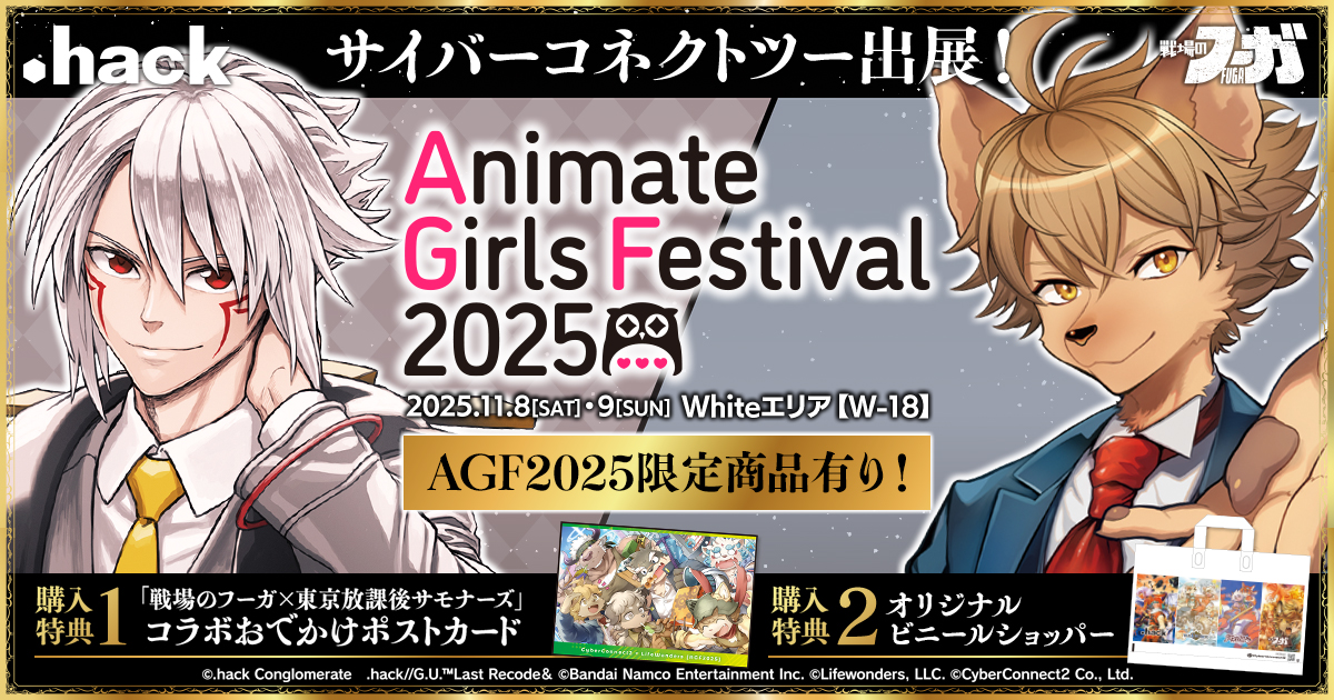 2025年11月8日(土)~9日(日)に東京・池袋で開催される「アニメイトガールズフェスティバル2025(以下、AGF2025)」にサイバーコネクトツーブースを出展することをお知らせします。本イベント限定商品として『.hack』シリーズ、『戦場のフーガ』の新商品を販売いたします。また、「サイバーコネクトツーxライフワンダーズ」のコラボ購入特典の配布も決定いたしました。