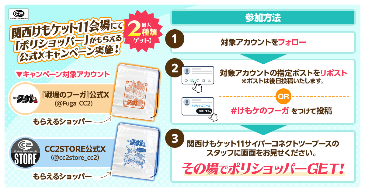 会場では、『戦場のフーガ』新商品やけもケット会場初出し商品の販売、ポリショッパーがもらえるプレゼントキャンペーン、そして『戦場のフーガ』スマートフォン版の体験試遊会を実施いたします。
