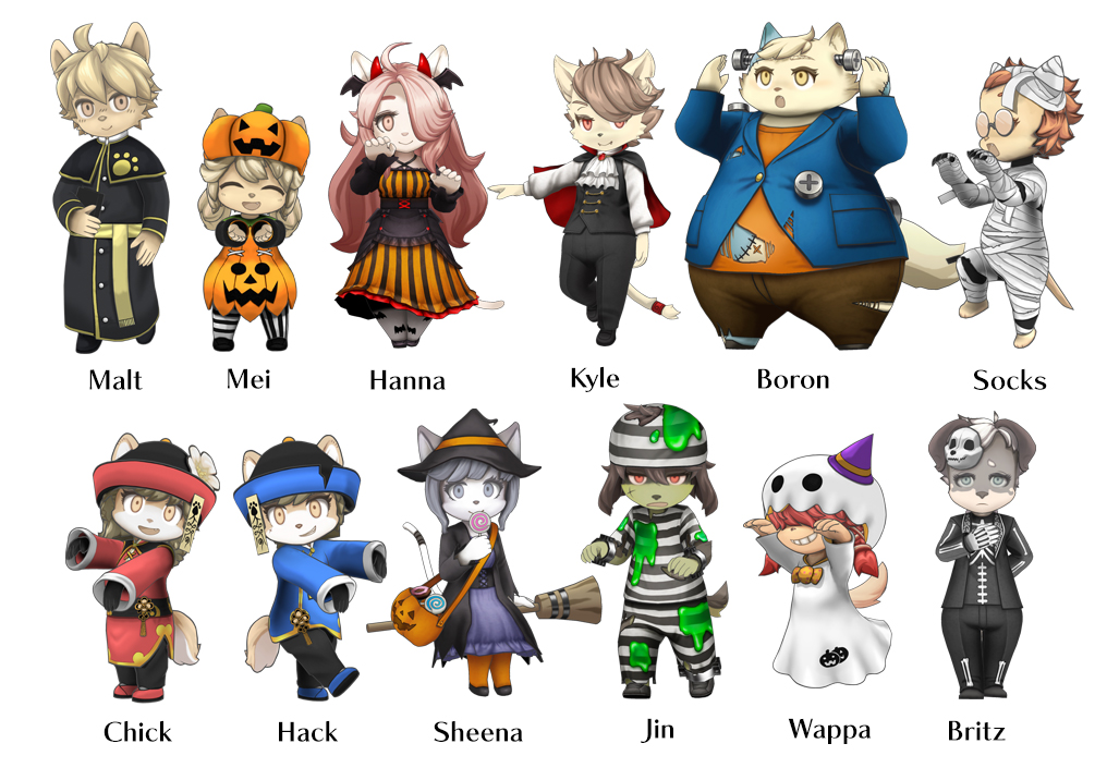 Halloween Costume Pack for Malt, Mei, Hanna, Kyle, Boron, Socks, Chick, Hack, Sheena, Jin, Wappa, and Britz (can be used during intermission and expedition).