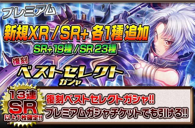 SR以上1枚確定は13連ガシャのみです。1回、6連ガシャはS