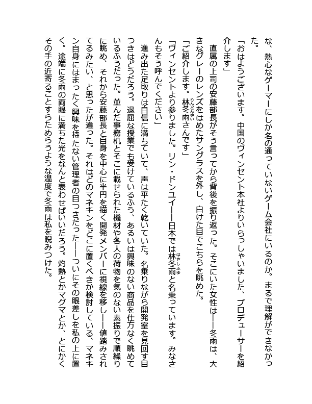 ゲーム開発会社に勤める春本樹は、日中共同制作のビッグプロジェクトのリーダーに抜擢される。そこに責任者として中国から派遣されて来たのは、大学時代に樹が一方的に別れを告げた元恋人の林冬雨だった。振られたことを恨んでいた冬雨は、主導権を握り樹にだけ無理難題を押し付けて……。女性同士の愛憎劇が幕を開ける――。