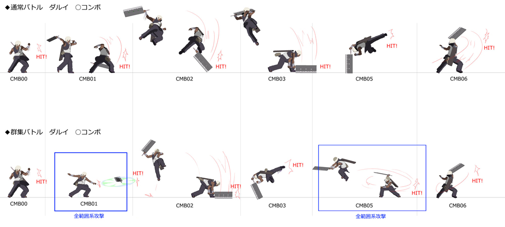 コンボ内容だけではなくヒットやダメージ量なども「群集バトル」専用の調整を行っています。