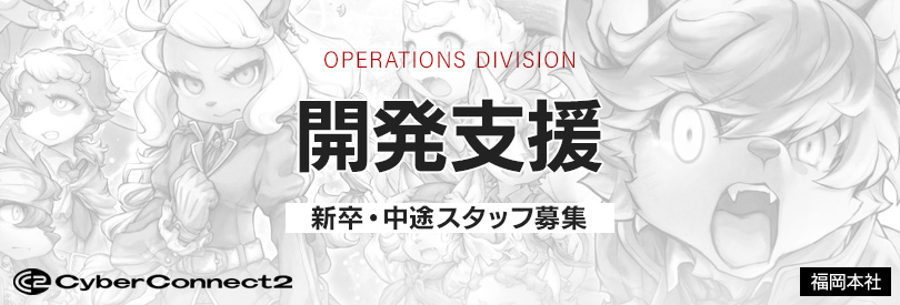 サイバーコネクトツーは約300名のスタッフのうち15%が業務部という管理・事務系職種のスタッフで構成されています。総務・経理・人事・企画・宣伝・広報・開発支援など、ゲームクリエイターがゲーム開発に専念するためには業務部のサポートが必要不可欠です。